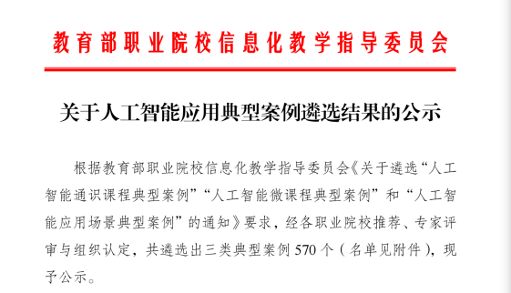 近日,教育部职业院校信息化教学指导委员会公布人工智能典型案例遴选结果公示,我校冉梅梅老师申报的人工智能通识课案例和徐磊老师申报的人工智能微…