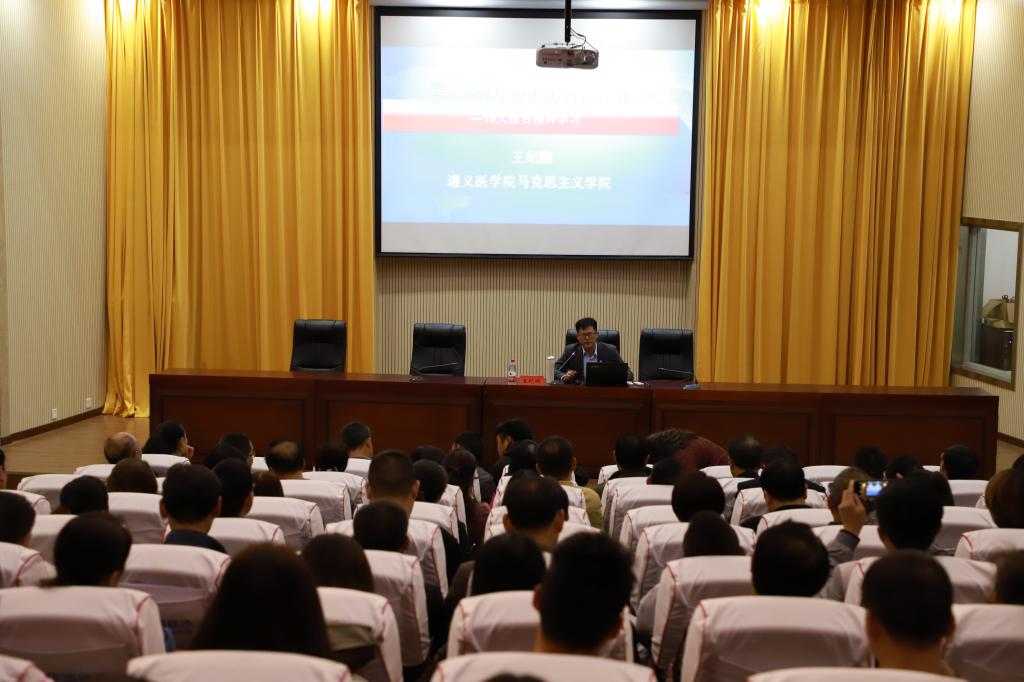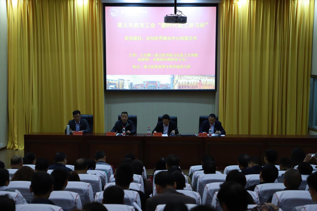 5月10日下午,遵义市教育系统新时代工人讲习所第一期课程第一讲“走向世界中心的宣言书”在我校图书馆三楼学术报告厅开讲。遵义市教育局党组成员、副局长、遵义市教育工会主席贺承国,遵义市教育工会常务副主席向声福及遵义市其他兄弟院校的领导出席了宣讲会。此次宣讲会由我校党委副书记张武晓主持,遵义医学院马克思主义学院副教授、思想政治教研室主任、历史学博士王纪鹏作宣讲。