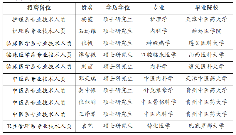 根据《遵义市人力资源和社会保障局关于做好第十一届贵州人才博览会事业单位引进人才有关工作的通知》、《2023年第十一届贵州人才博览会遵义市事业单位人才引进公告》有关规定,现将遵义医药高等专科学校人才引进线下考核硕士学历通过人员名单予以公示,公示时间为:2023年6月7日-6月15日,公示期间,如有异议,请向有关单位反映。