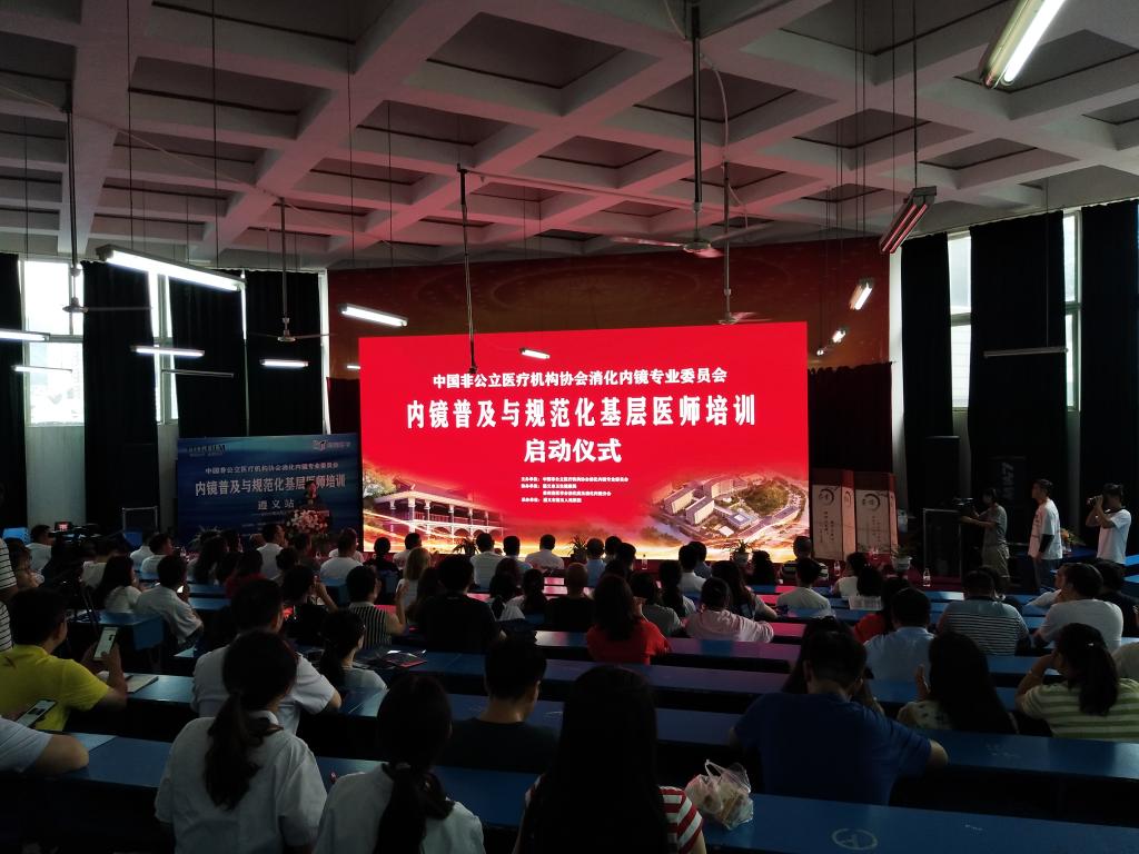 2019年8月3日,中国非公医疗机构协会消化内镜专业委员会内镜普及与规范化基层医师培训启动仪式在遵义市第五人民医院(医专附院)内科楼阶梯教室举行,遵义市卫生健康局局长刘勇、清华大学北京长庚医院内科部部长、消化中心主任姜泊,北京大学第三医院消化科副主任、消化内镜中心主任黄永辉,遵义医科大学附属医院消化病医院院长庹必光,贵州省人民医院内镜科主任李红灵,中国人民解放军北部战区总医院内窥镜科副主任杨卓,中国中医科学院西苑医院内镜中心主任蔡毅东,中国非公立医疗机构协会消化内镜专业委员会副主任委员张博,上海市第一人民医院消化科副主任医师、遵义市消化病临床医学中心执行主任程礼,遵义市第五人民医院(医专附院)党委书记、院长王平,遵义市第五人民医院(医专附院)消化内科主任、遵义市消化病临床医学中心副主任郑义,遵义市第五人民医院(医专附院)院领导班子及全市各级医疗机构300余名同仁参加启动仪式。仪式由遵义市第五人民医院(医专附院)副院长张文娟主持。