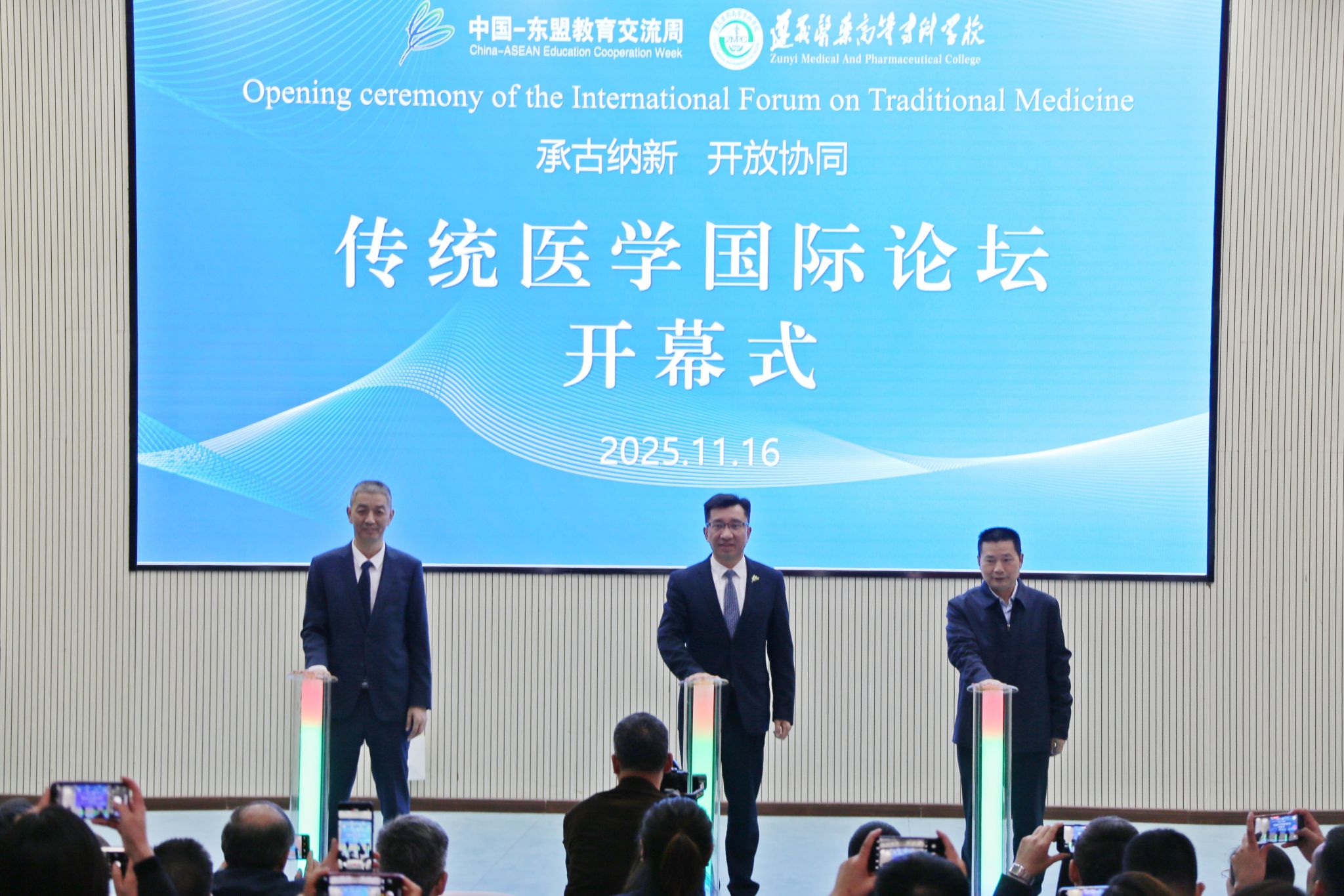 11月16日,2025中国—东盟教育交流周“传统医学国际论坛”在我校隆重开幕。省教育厅副厅长白震出席会议并讲话,遵义市人民政府副市长吴起、学校校长陆远富分别代表市政府和学校向与会嘉宾致欢迎辞。