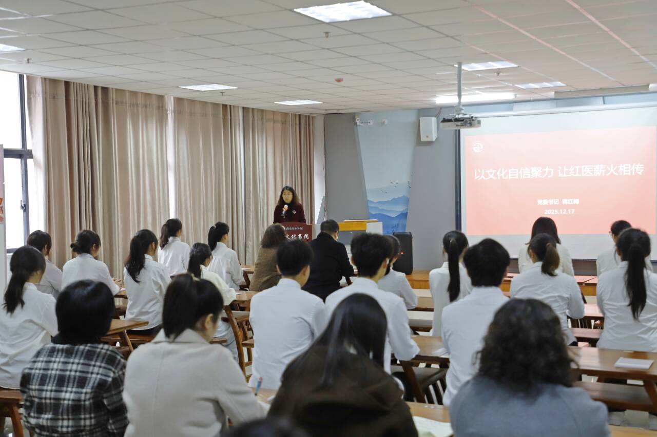 最后,学校党委书记蒋红梅教授以《以文化自信聚力 让红医薪火相传》为题,为在场师生讲授了一堂深刻而生动的思政课。她紧密结合遵义红色文化与学校医药教育的办学特色,深刻阐述了文化自信的丰富内涵与时代意义,深入剖析了红色文化中蕴含的“人民至上”初心、“攻坚克难”意志与“薪火相传”责任,以及中医药文化“天人合一”“辨证施治”的智慧与价值。她强调,红色文化与中医药文化在精神上高度契合,共同构成了学校“红技精业”育人理念的文化根基,要把这两种文化的力量融合起来,培养既有红色信仰、又有精湛医术的医药人才。她对宣讲团及全体师生提出殷切希望,勉励大家要做“真学真信”的践行者、“善讲善传”的创新者、“知行合一”的示范者,自觉肩负起传播真理、传承文化、培育新人的光荣使命。