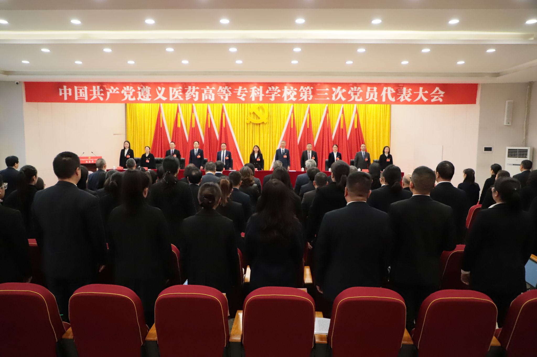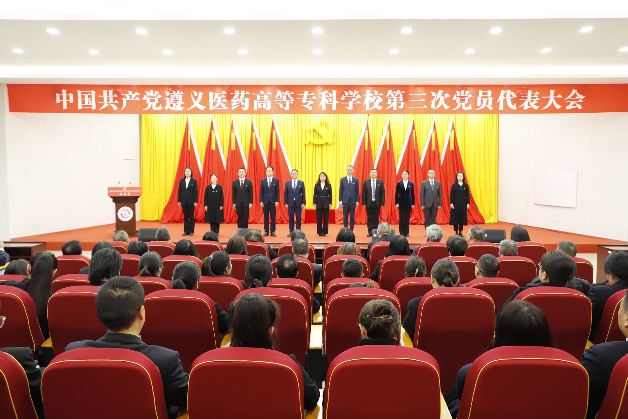 大会号召,全校各级党组织、全体共产党员和广大教职医护员工生要更加紧密地团结在以习近平同志为核心的党中央周围,坚定拥护“两个确立”,坚决做到“两个维护”。在新一届学校党委的坚强领导下,将思想和行动统一到党代会精神上来,把智慧和力量凝聚到党代会确定的目标任务上来,坚守为党育人、为国育才初心使命,解放思想、振奋精神、同心同德、锐意进取,为实现学校跨越式发展、服务区域卫生健康与中医药产业发展,奋力谱写遵义医药高等专科学校更加辉煌灿烂的新篇章而努力奋斗!