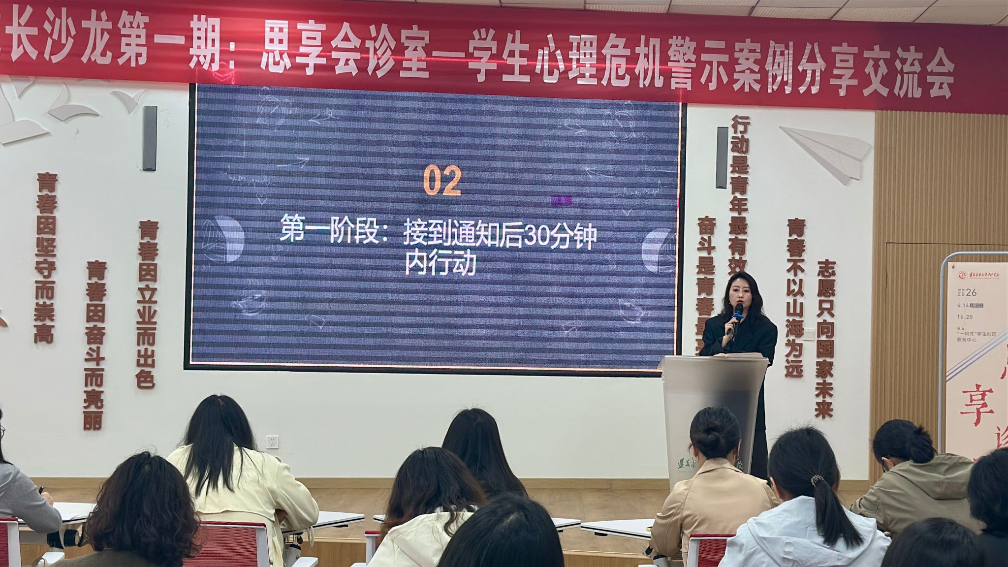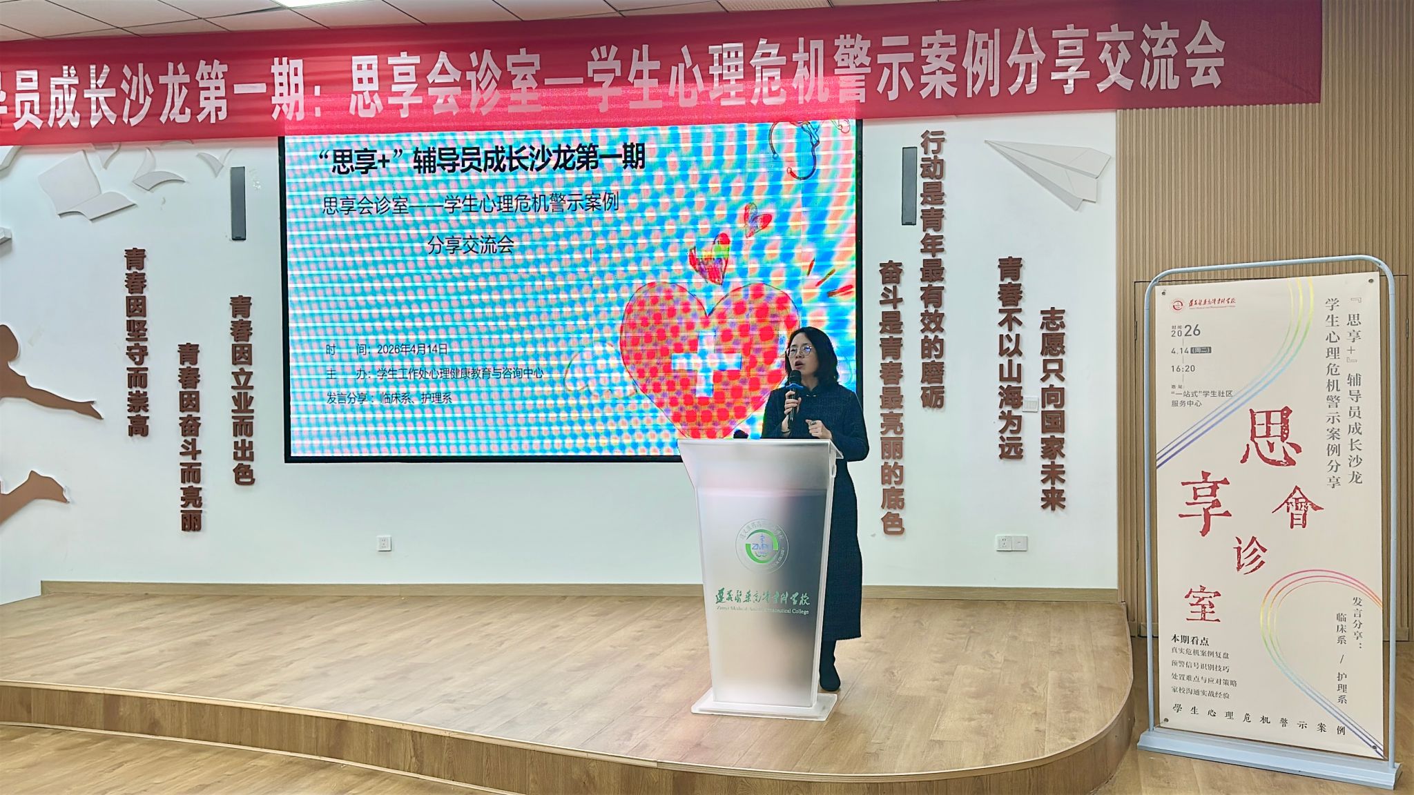 为深入贯彻落实立德树人根本任务,提升辅导员队伍在学生心理危机识别、处置与跟进等方面的实战能力,2026年4月14日,第一期“思享+”辅导员成长沙龙在“一站式”学生社区服务中心顺利举行。本期沙龙以“思享会诊室——学生心理危机警示案例分享会”为主题,聚焦实习学生突发极端事件的应急处置与心理干预。学校党委副书记、校长陆远富,党委委员、副校长李冬梅,全体专职辅导员共50余人参加了本次活动。沙龙由学生处心理健康教育与咨询中心主持,临床系、护理系作案例发言分享。