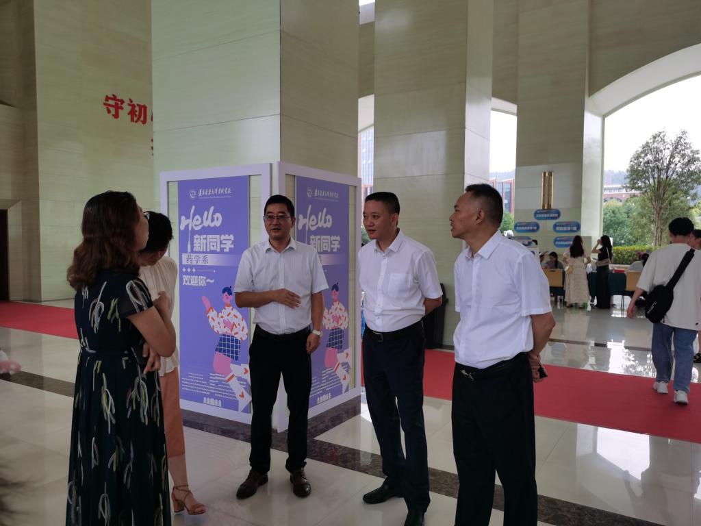真情慰问,情暖现场。9月7日上午,校党委书记俞松及相关部门负责人莅临我系新生报到现场,详细了解迎新工作的进展、新生报到流程和住宿安排情况,并向迎新一线的全体人员表示感谢,对志愿者饱满的精神状态和热情周到的服务表示充分肯定,嘱咐他们耐心、细心地做好迎新服务工作,给新生和家长舒适、美好的体验。随后药学系领导班子前往宿舍看望新生,并与新生及家长们亲切交谈,询问报到情况,鼓励同学们尽快适应大学的学习、生活。